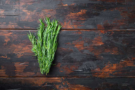 Raw fresh tarragon bunch, on old wooden background, top view