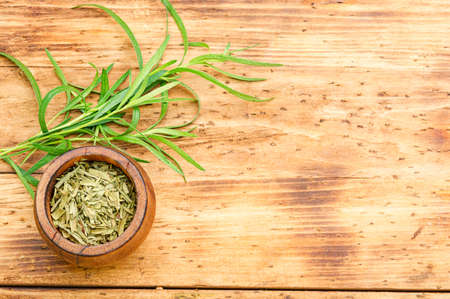 Tarragon or estragon.Artemisia dracunculus.Fresh and dry tarragon herb on wooden table.Space for text
