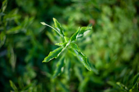 Macro closeup green leaves texture shot of small plant, dark green
