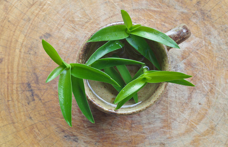 Fresh green Tarragon leaves on the wood background