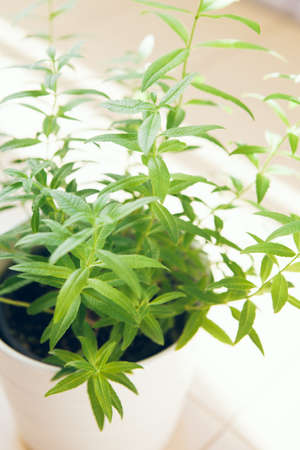 Vertical photo of Aloysia citrodora, lemon beebrush, lemon verbena growing on the balcony in a pot. Selective focus and natural light photo