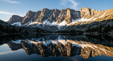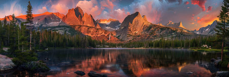 The tranquil reflection of the alpenglow on a crystalclear lake at the foot of the mountains