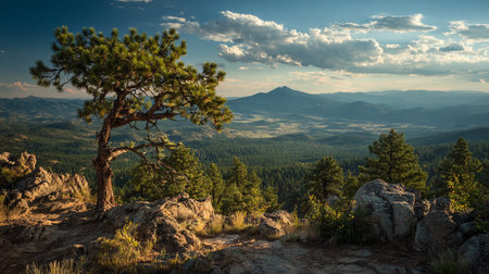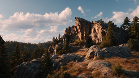 Scenic Mountain Vista at Sunset with Rocky Outcrops and Dense Evergreen Trees
