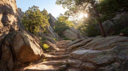 Hiking path through rocky terrain with sunlight shining in a forested area