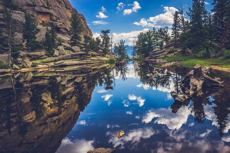 Perfectly still water on Gem Lake with reflection of blue sky, clouds, mountains, and trees, Estes Park, Colorado