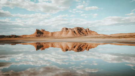 A mirror-like reflection of badlands ridges in the water under a cloudy sky, creating a symmetrical visual of this rugged landscape