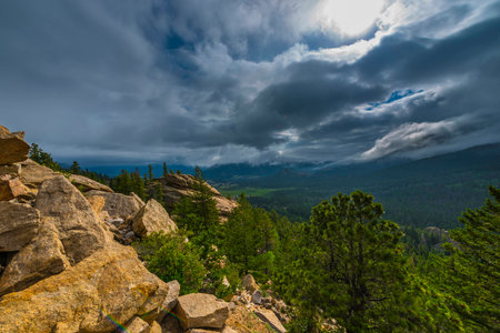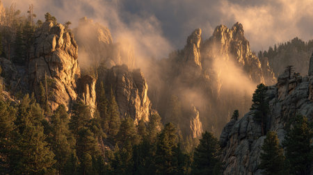 Experience the breathtaking beauty of a rocky mountain landscape as sunlight filters through dramatic clouds, illuminating peaks and misty forests, capturing nature's tranquility.