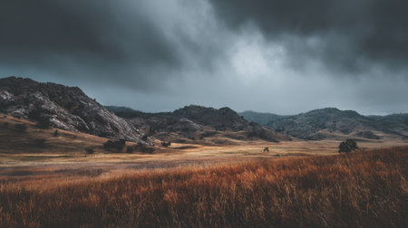 A breathtaking view of a vast golden grass field surrounded by rolling hills and dark clouds, creating a dramatic and serene atmosphere in nature.