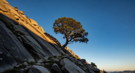Pine tree on the top of a mountain in the morning light