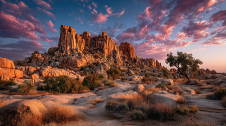 Experience the breathtaking beauty of majestic rock formations illuminated by sunset in a tranquil desert landscape, showcasing vibrant colors and natural serenity.
