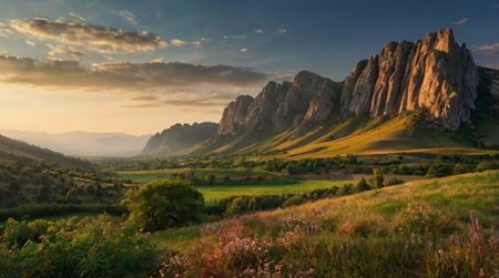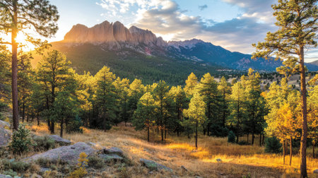 Captivating mountain landscape features vibrant colors at sunrise, showcasing lush trees and rocky terrain. A peaceful scene ideal for nature lovers.