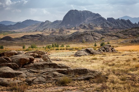 Stunning rocky mountain landscape featuring vibrant skies filled with clouds. Unique rock formations stand tall amidst lush autumn foliage, showcasing nature's beauty.