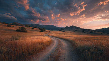 A winding dirt road leads through golden fields, illuminated by a breathtaking sunset. Dramatic clouds enhance the tranquil ambiance of this stunning landscape.