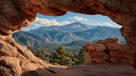 A stunning view of majestic mountains captured through a natural rock arch, showcasing the beauty of the landscape under bright daylight.