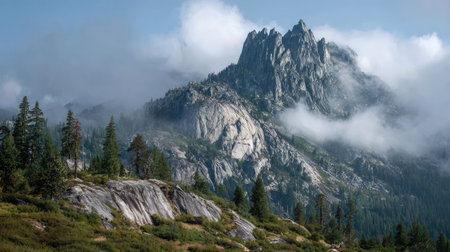 Discover a stunning mountain landscape featuring towering peaks, lush forests, and soft clouds. This breathtaking scene captures nature's beauty and tranquility, perfect for outdoor enthusiasts or those seeking scenic vistas.