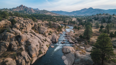 A tranquil river winds through a rugged terrain of large boulders and pine trees, with majestic mountains rising in the distance under a soft sunset sky.