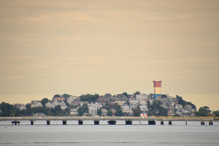 View of Portland Maine from the observatory on Munjoy Hill showing the harbor.