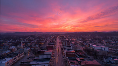 Town street at vivid sunrise twilight hour