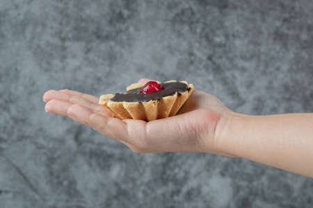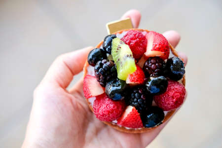 Fresh fruit mini tart in womans hand. Modern patisserie concept.