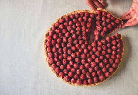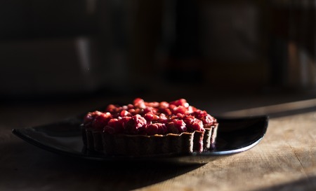 A delicious raspberry tart with a buttery, golden crust and fresh raspberries arranged on a pastel-colored caf plate.