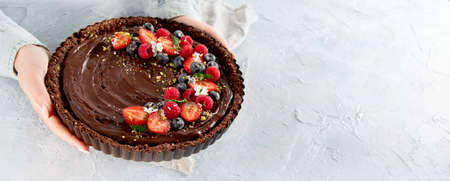 Young woman holding homemade chocolate tart on light gray background. Panorama, copy space