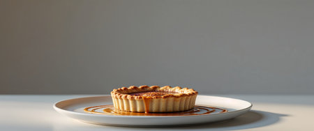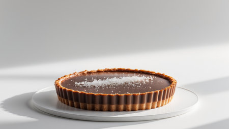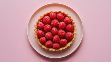 A delightful berry tart topped with fresh raspberries and blackberries, set against a soft pink background. Perfect for dessert lovers and special occasions.