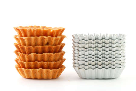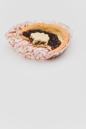 isolated cherry jam tart in a paper backing cup on a white background with text space