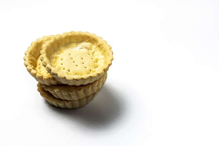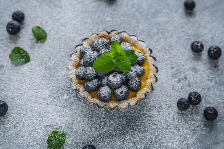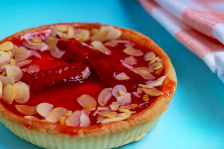Close up view - delicious fresh shortcrust tart cake with yellow cream for sale on counter of shop, grocery, market, cafe or bakery. Dessert, sweet food and confectionery concept