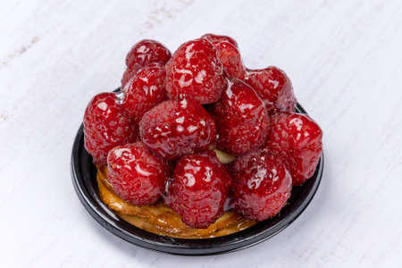 This beautiful raspberry tart features a crisp pastry base topped with fresh raspberries and a mint leaf, presenting an inviting dessert option.