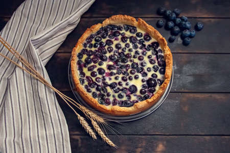 Rustic shortbread pie with blueberries in sour cream filling on a wooden background with kitchen towel and wheat ears.