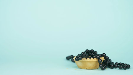 fashion art. minimalism. the black beads fall into the tartlet. blue background