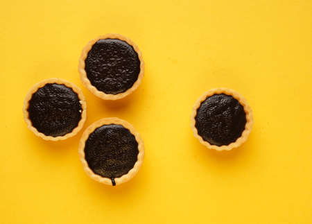 A picture of four homemade chocolate tart on yellow background. Same colour subject and background concept