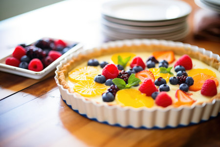 Exquisite tartelette bourdaloue adorned with fresh raspberries, blueberries, and almond slices. a perfect blend of sweet and nutty flavors against a dark backdrop, showcasing the delectable pastry in an elegant presentation.