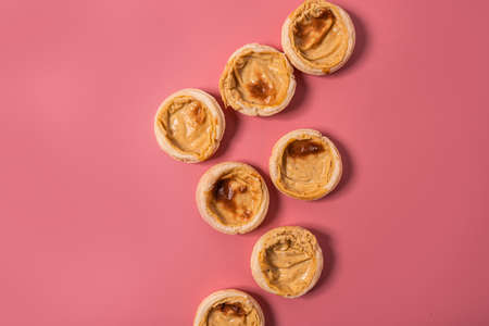 Portuguese sweet dessert pasteis pastel de nata overhead shot top view on pink background