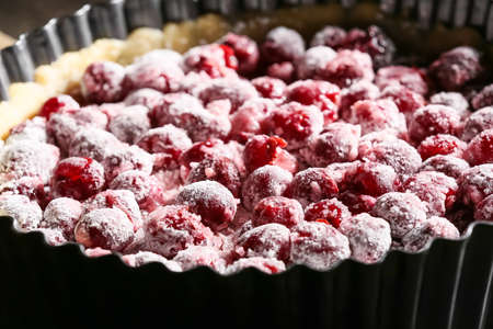 Close up Cheese tart topping with slices of strawberry and blackberry with icing sugar.