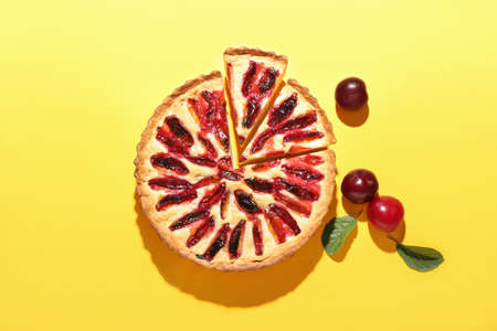 Homemade cherry pie with jam on wooden table background. Copy space is available.