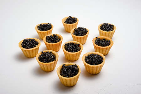 natural black caviar in homemade shortcrust pastry tartlets on a white background