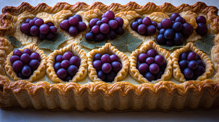 An exquisite tart showcases vibrant grapes and delicate pastry craftsmanship.