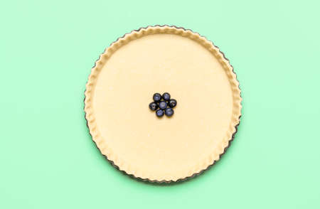 Baking blueberry pie, flat lay. Uncooked pie crust and blueberries filling, on a green background. Homemade pastry dough with butter and shortening.
