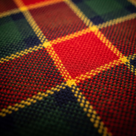 Background of fabric with red and green Tartan-type Scottish designs and yellow lines