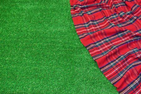 Red Picnic Tartan Empty Blanket On The Fresh Trimmed Grass In Summertime, Top View