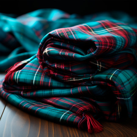A close-up view of a traditional Scottish tartan, folded to create a dramatic radial pattern.