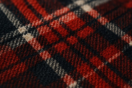 A detailed macro shot of a cozy red, black, and white plaid fabric, showcasing its soft, textured surface and classic checkered pattern. The shallow depth of field creates an abstract yet inviting background, perfect for themes of warmth, comfort, and traditional design.