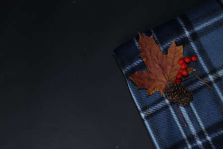 Yellow maple leaf, red mountain ash and a small bump on a plaid plaid