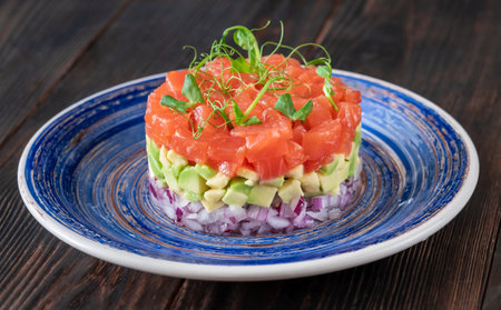 Salmon tartare with chopped avocado on plate