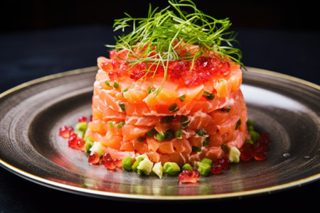 Discover a beautifully presented salmon tartare topped with bright microgreens and fish roe, perfect for gourmet dining and artistic culinary displays.