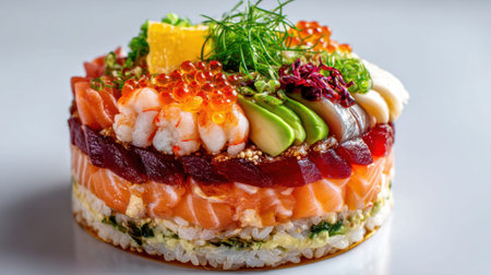 A stunning sushi cake showcasing colorful layers of fresh fish and seafood, beautifully garnished with vibrant toppings, perfect for celebrations and gourmet dining.