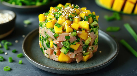 Delight in a refreshing mango and tuna tartare, featuring vibrant colors and a mix of textures with green onions and sesame seeds, perfect for any occasion.