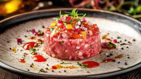 A stunning presentation of gourmet beef tartare featuring fresh vegetables, zesty seasoning, and colorful sauces on an elegant plate. Perfect for culinary lovers.