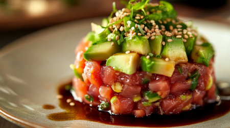 A vibrant tuna tartare dish topped with fresh avocado and sesame seeds, beautifully presented on a plate, perfect for gourmet dining experiences.